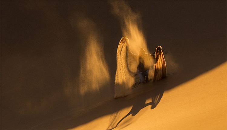 越接近日落,荒凉的地表石头就越少,沿途只剩了无数草方格保护着的公路,偶尔有野骆驼群,自顾自地在荆棘边踱步,时光停顿,若几世纪之前的样子。夕阳渐沉,沙丘被风蹂搓成了鱼鳞状,阳光就在沙丘上镀上一层红色。再晚些,月色和星光就开始霸占了整个沙漠的天空,在沙丘之巅看月光,那种毫无人烟的清冷又会让心悸动。