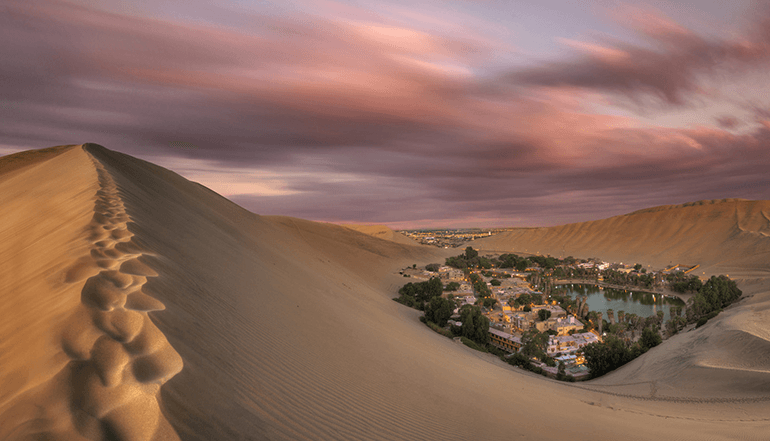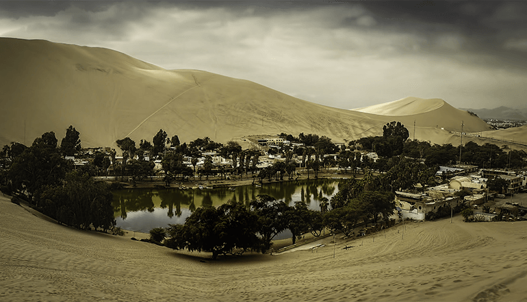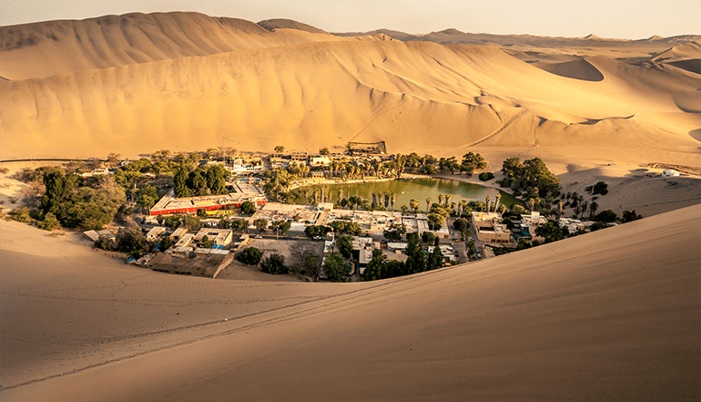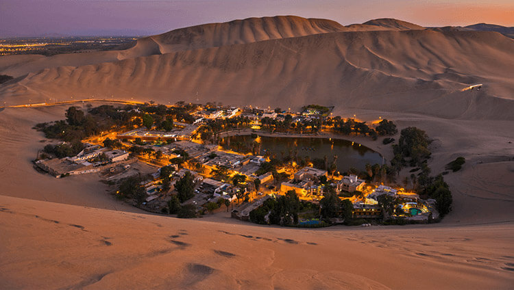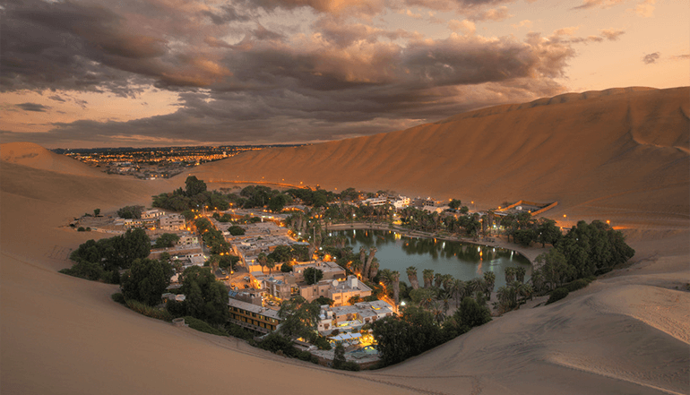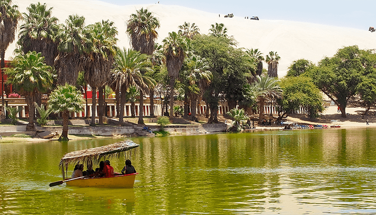 后乘车约 1 小时前往秘鲁伊卡城境内的 ICA,这是秘鲁一块沙漠中的绿洲,华卡齐纳绿洲素有“美洲绿洲”的美誉,是一个环湖而建的小村庄,这里现在成了附近伊卡城人的度假胜地。以一池天然湖水为中心,饭店餐馆集中在湖边,湖水周边的腹地不大,四周被高达数百公尺的沙丘包围。午餐后返回利马,傍晚可以欣赏到迷人的太平洋夜景。