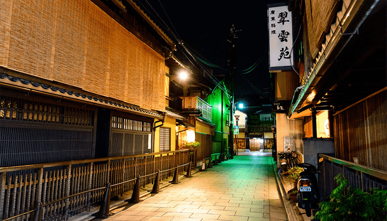 电影艺伎回忆录中曾出现的场景,祗园花见小路,是祗园街正中南北走向的一条保持了京都历史古老风貌的著名街道。有机会时,间或可见外出献艺的艺伎的挑帘进出、小步急行的窈窕身影,增添古都风情。