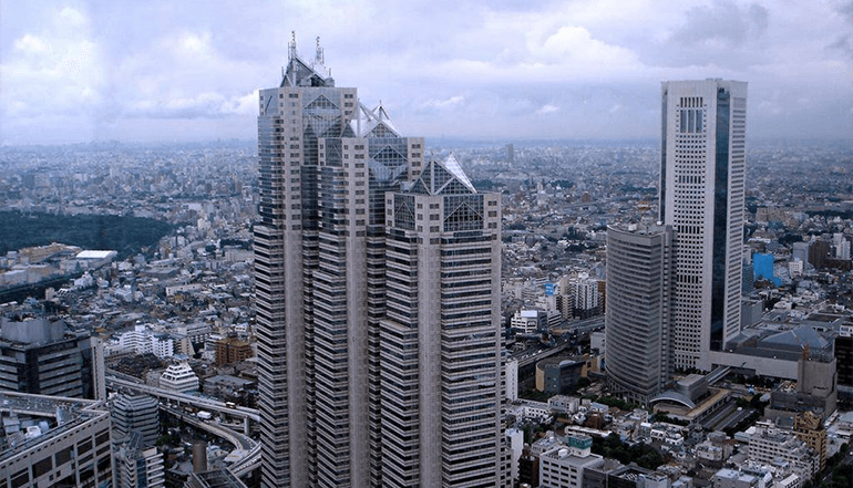 都厅大厦与东京新都厅是两栋相连的 45层摩天大楼,高 202米,东京都政府所在地,也是新宿的地标建筑之一。登上可瞰俯东京全景。