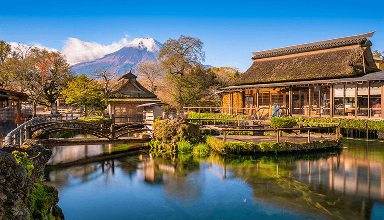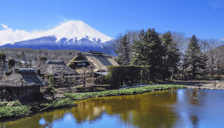 之后将前往位于山梨县忍野村的忍野八海,这里保存着几百年以来原汁原味的日式农村建筑:合掌屋,村中有 8个清澈见底的水池,水源来自于富士山山顶融雪,融化后渗透至地下,经层层过滤后从忍野村中冒出,此处为日本名水百选地之一,泉水可直接饮用,甘甜可口。