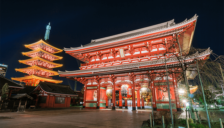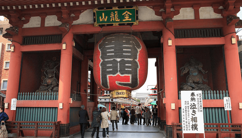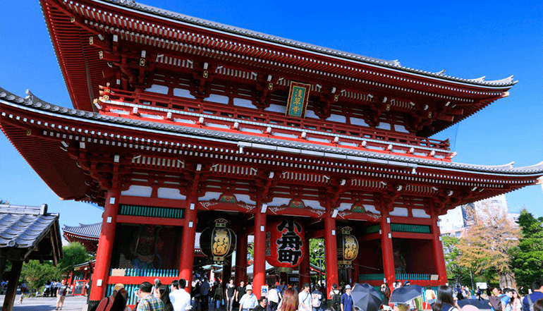 东京浅草寺及仲见世商业街为日本观音寺总堂,相传在古天皇 36年 3月 18日有三位渔民在出海捕鱼时,看到观音显现,并建立浅草寺来供奉观音。仲见世商店街是浅草寺前的购物小街,游客可在此选购特色手信。