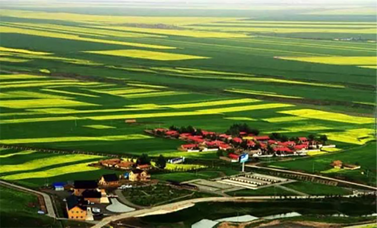 北依祁连山,西起永安城,东到玉隆滩,南邻大坂,浩浩汤汤,沿河倾斜万里,金色花海上至苍穹下至田野,相映相衬,一望无际,气势颇为了得。