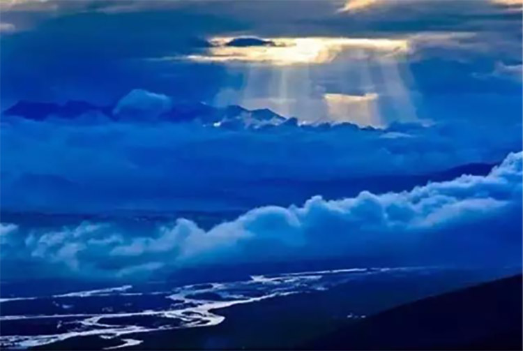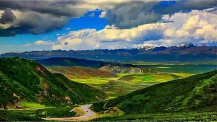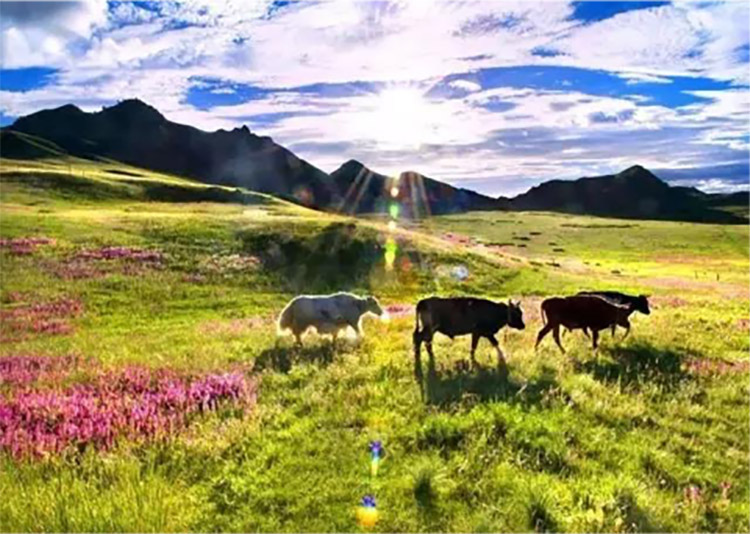 云朵从天上低落到了山间,黑色的牦牛在四处游荡,远处传来了悠远的歌声,山顶上还是白雪连绵。